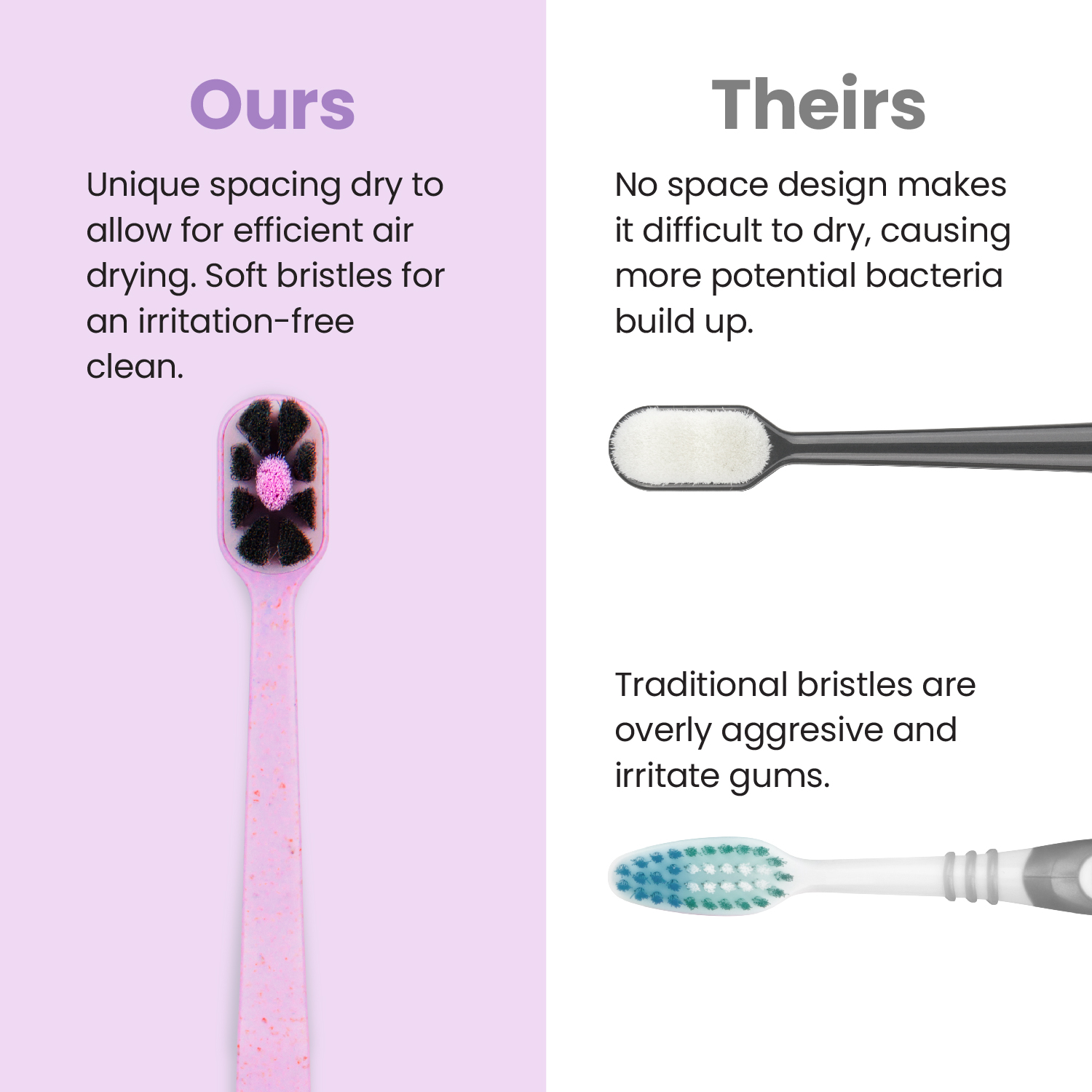 • Brush head features a unique spacing design to promote airflow and drying, preventing bacterial build up.