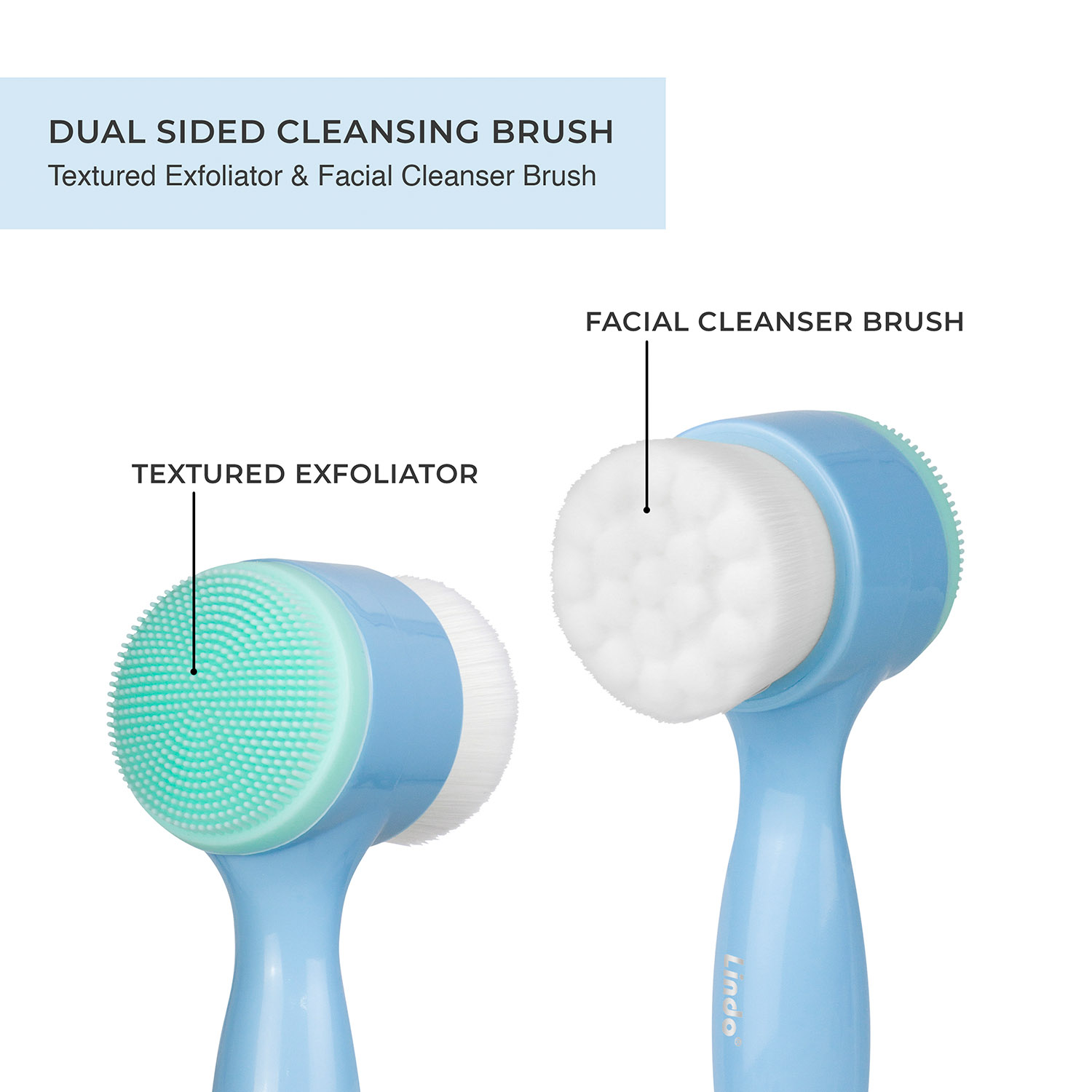 • The Lindo Face Cleansing Brush is the perfect 2-in-1 cleanser to help fight pore blockage and uneven skin tone. One side features lush microfine bristles for a deep and thorough cleanse, while the other side features soft silicone bristles for gentle exfoliation.