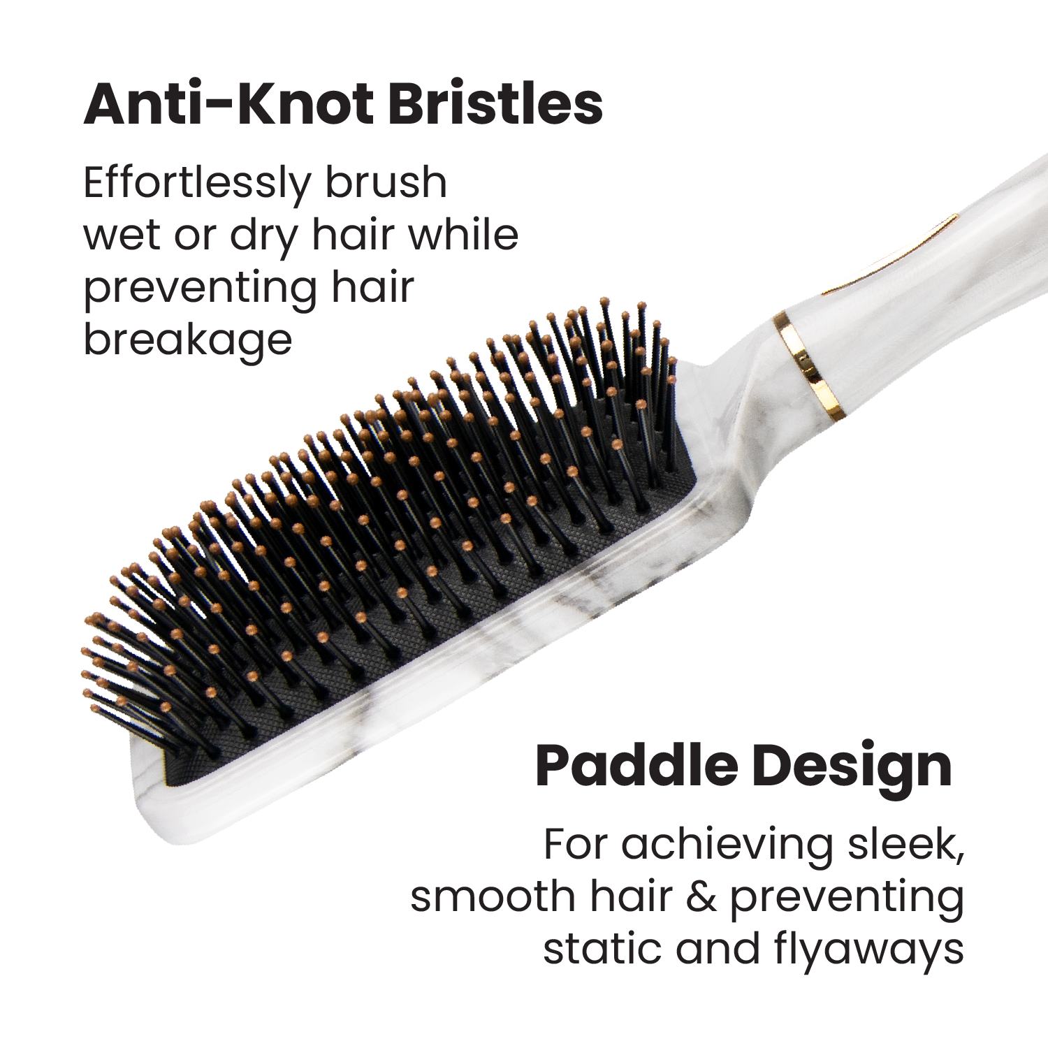 - The Lindo Marble Paddle Hair Brush is for achieving sleek, smooth hair and preventing static and flyaways. Designed with flexible anti-knot bristles for effortless hair brushing of wet or dry hair while preventing hair breakage. Easily detangle hair, removing knots without pulling, and distribute natural hair oils or products from roots to ends.