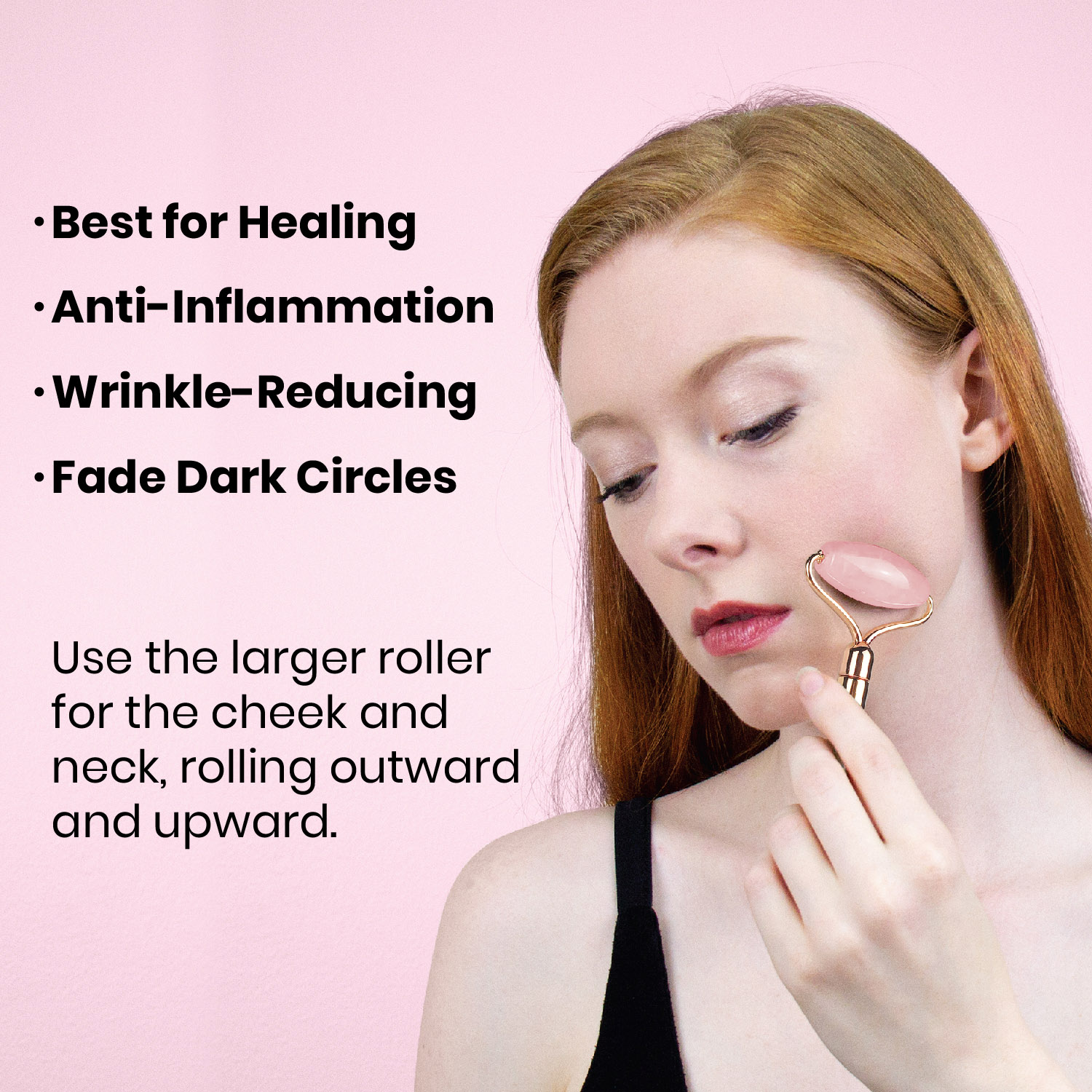 - The natural cooling effect of the rose quartz stone helps alleviate puffiness, wrinkles, and dark circles.