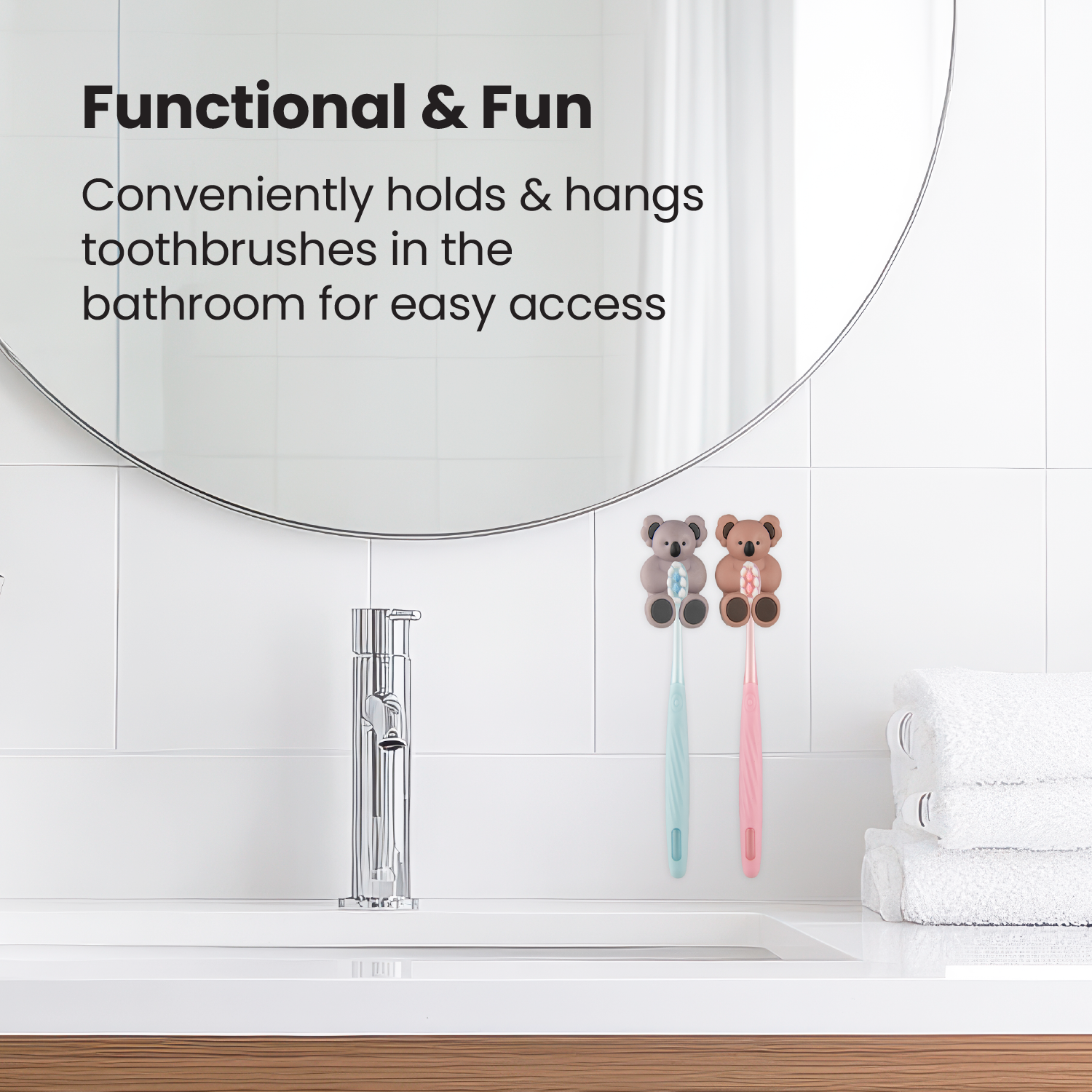 - Includes stylish koala holders with suction cups for hanging toothbrushes on flat surfaces in the bathroom